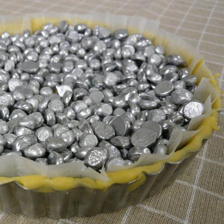 グラシンカップ・重石を入れ、オーブンで焼く(電気オーブン200℃15分・ガスオーブン190℃15分)。