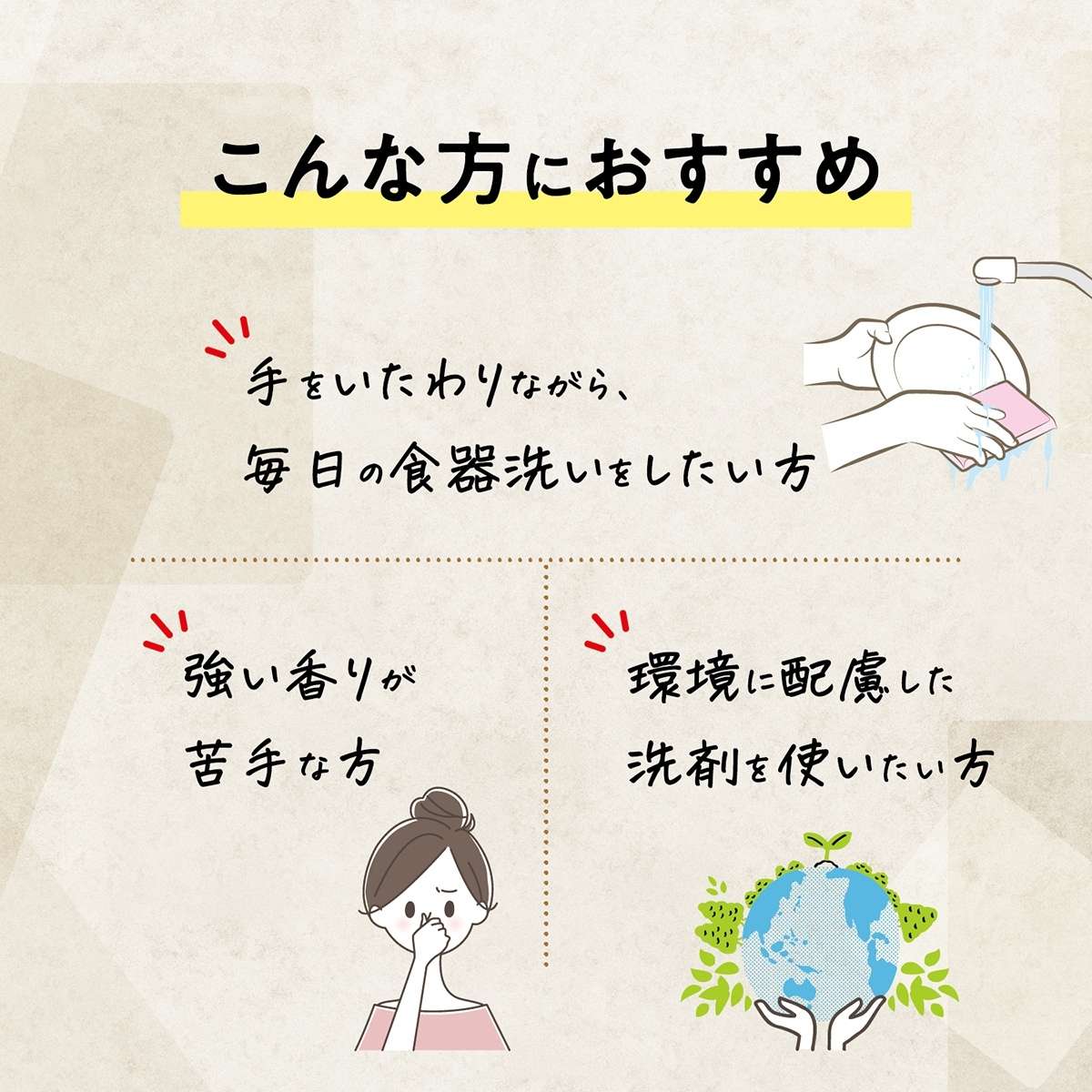 ・荒れ性の方や長時間使用する時、また原液をスポンジに含ませて使用する時は、炊事用手袋を着用し、使用後は手をよく水で洗い、クリームなどで肌の手入れをする。