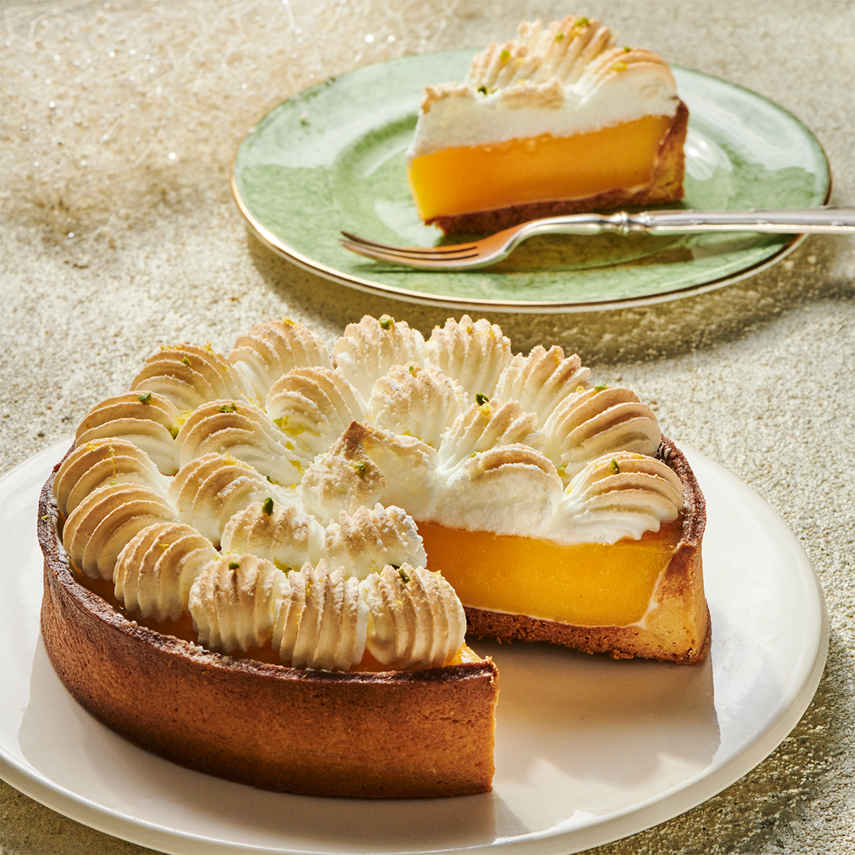 タルト生地にレモン果汁をたっぷりしぼったクレーム・シトロンを詰め、イタリアンメレンゲを絞って焼きめをつけしあげます。