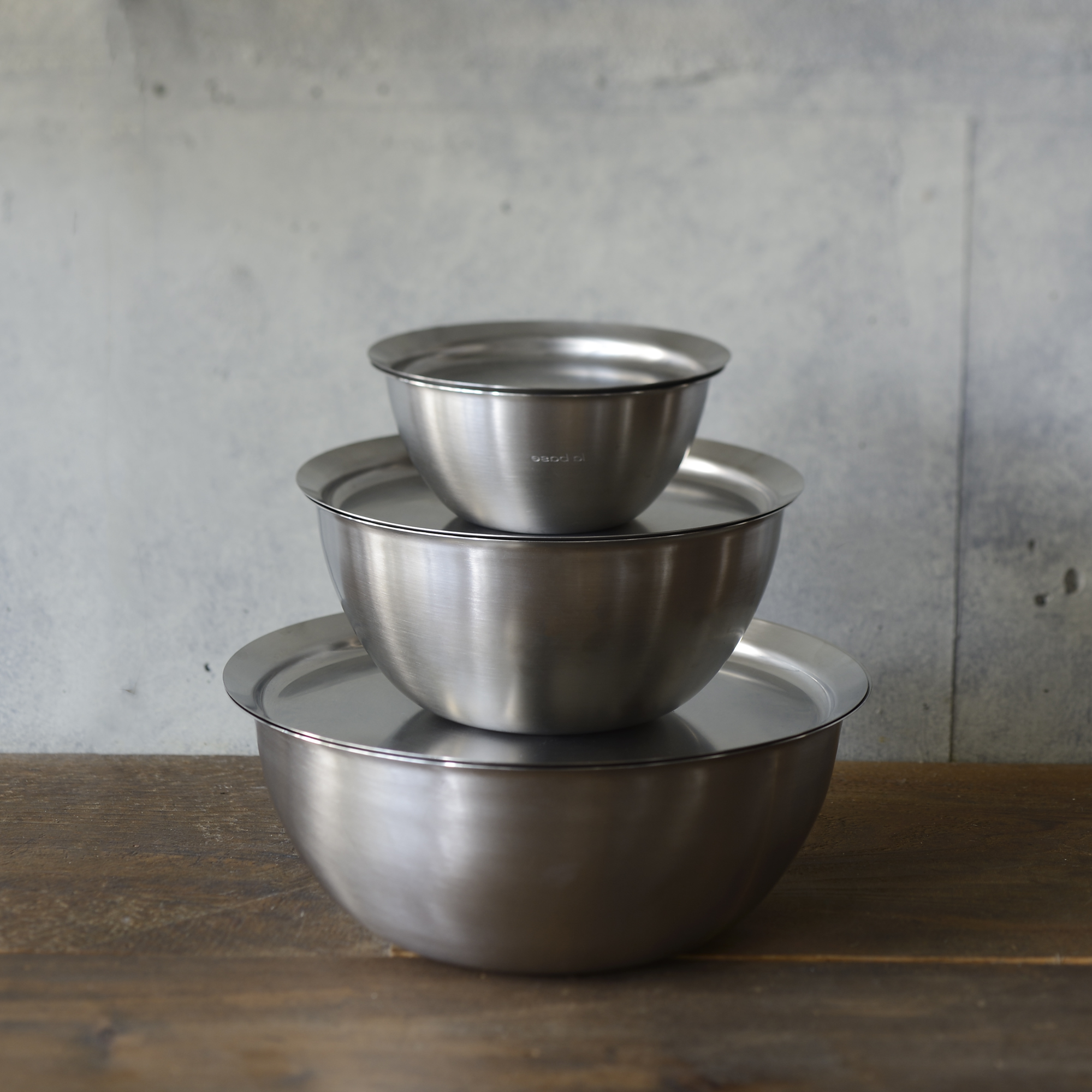 サイズは大(27cm)、中(21cm)、小(15cm)の3種類。同じサイズのボウルやざると組み合わせられられます。重ねることで、スッキリ収納することができます。