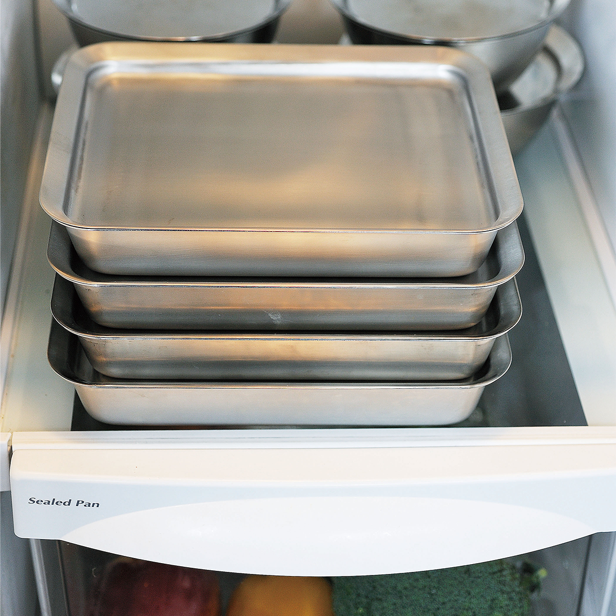 角バットの上に乗せればプレートが蓋となり、保存容器として使えます。ラップが不要になるので環境にもやさしい。また、スタッキングが可能になり、作業スペースを確保できたり、冷蔵庫の中でもコンパクトに収まります。