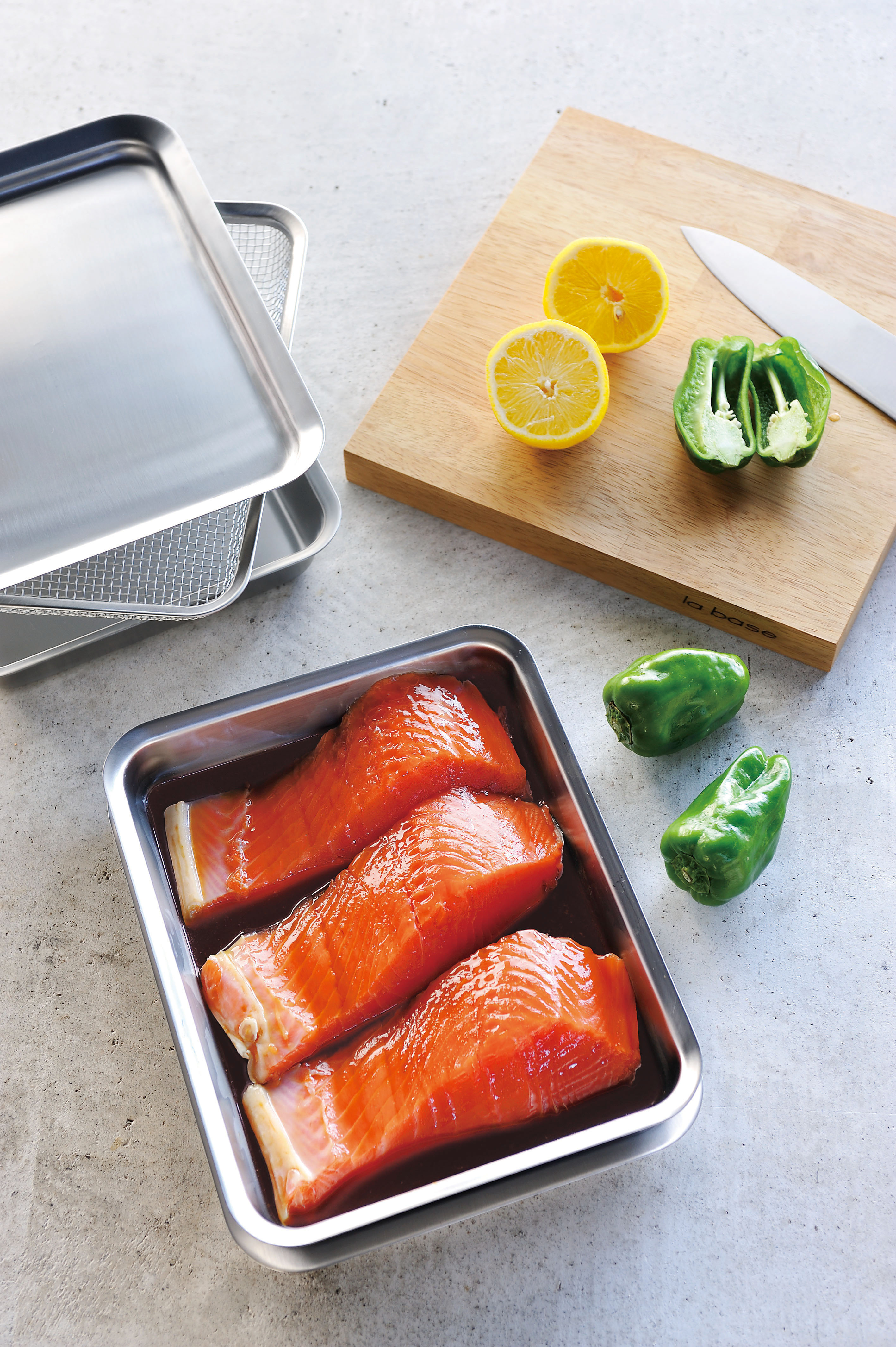 食材の一時置きだけでなく、蓋や水受けなど下ごしらえをしたその後のことまで配慮し尽くしたラバーゼの角プレート。常備菜や夕食などで、たくさんの食材を一気に下ごしらえする時は、とくにその良さを実感できると思います。