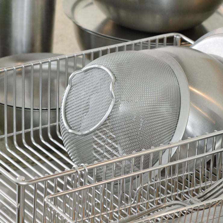 同じサイズのボウルと重ねて、スッキリ収納することができます。下ごしらえで、ざるやボウルなどたくさん使った後の片付けも快適に。シンクや、水切りかごの中でもコンパクトに収まります。