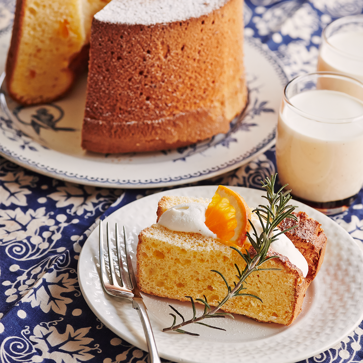 バニラビーンズペーストを小さじ1/2入れて作るシフォンケーキです。さわやかなオレンジの香りでふわふわな触感のシフォンケーキです。