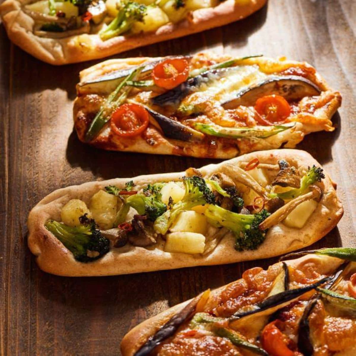 なす・オクラ・プチトマト、じゃが芋・ブロッコリー・きのこ類の2種の具材を全粒粉の生地にのせて香ばしく焼き上げます。