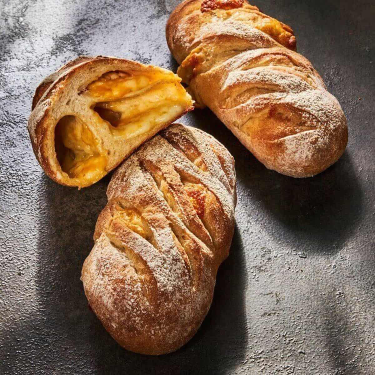 中種法で作るハードな生地に、グリュイエール・ゴーダ・チェダー・モッツアレラの4種のチーズがたっぷり!焼き立てをカットするとチーズがとろけます。