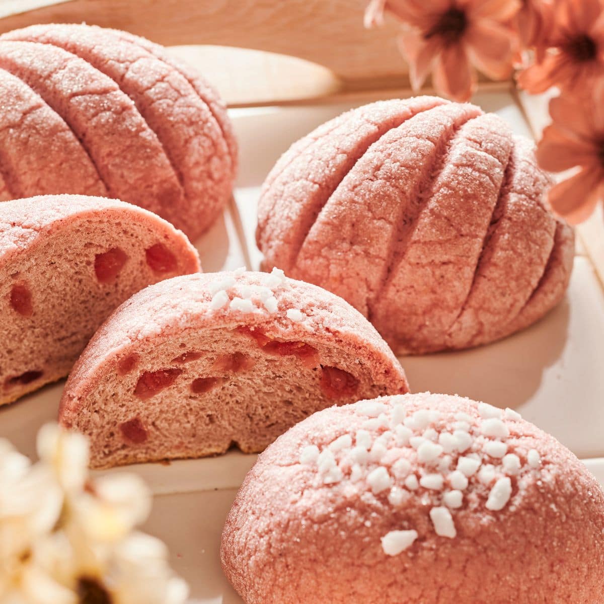 生地だけでなくクッキーにもいちごピューレといちごパウダーを加えた苺のメロンパンです。クッキーのサクッと感といちごの風味が春らしい限定メニューです!