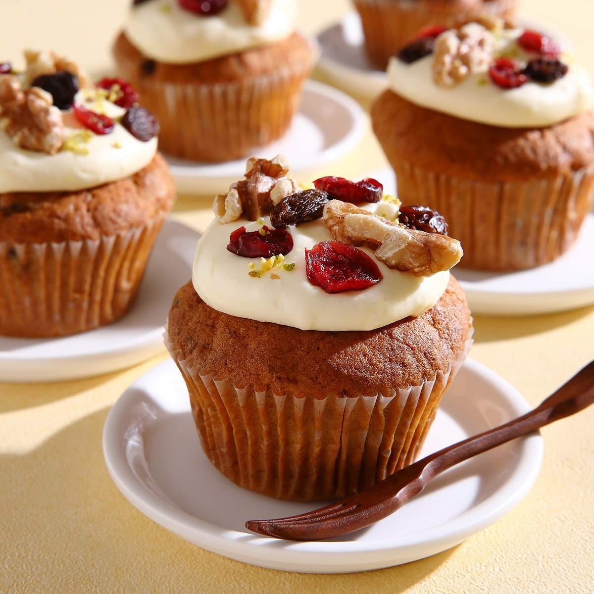 マフィン型で焼くから、コロンとした可愛らしい形に仕上がります。シナモンの香りが効いた生地に、くるみ、レーズン、クランベリーも入った具沢山な味わい。しっとりとした食感で、野菜と果物、ナッツの自然な甘みが楽しめます。焼き上がったら、クリームチーズのフロスティングをたっぷり乗せて、可愛くデコレーション。朝ごはんにも、おやつにもぴったりです。