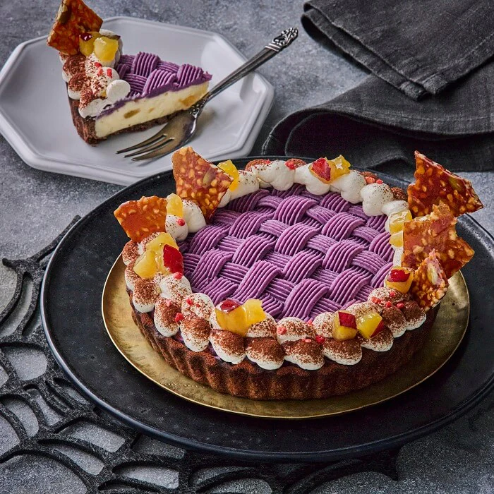 パイのようなサクサク食感のココアブリゼを器にし、りんごジャム入りのカスタードクリームをたっぷり詰め、紫芋クリームをしぼります。ザクザクのヌガティーヌとさつま芋をトッピングし、ハロウィンにぴったりなにぎやかなタルトに仕上げます。