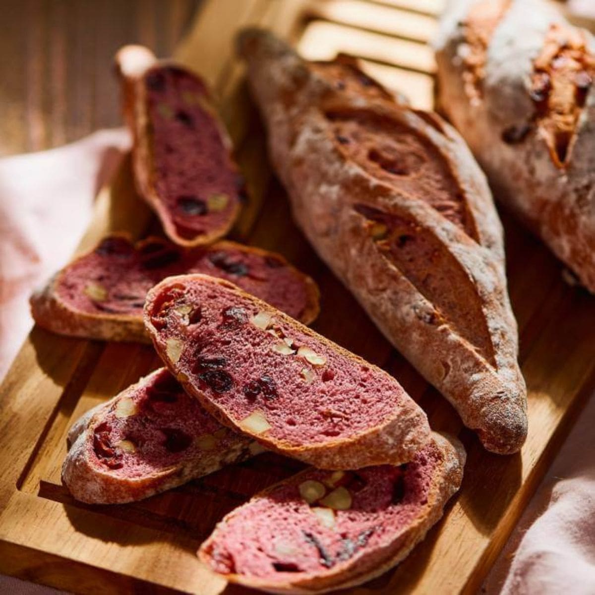 仕込み水のほとんどがラズベリーピューレの生地にアーモンド・クランベリーを混ぜ込んだパン。ベリーの鮮やかな赤い生地に、甘酸っぱい香り&味わいは絶品!
