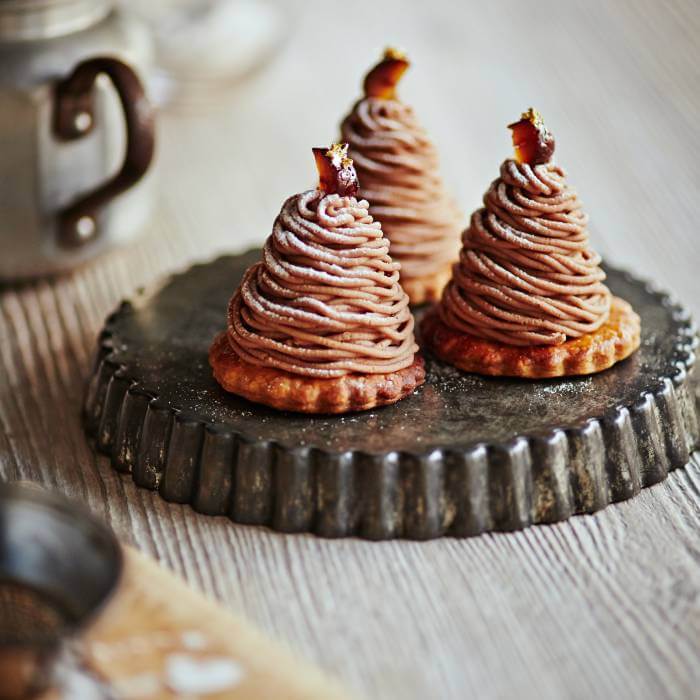キャラメリゼした練りこみパイ生地を土台にし、栗を混ぜた生クリームとマロンクリームをしぼります。サクサクの土台と濃厚なクリームが新感覚のモンブランです。
