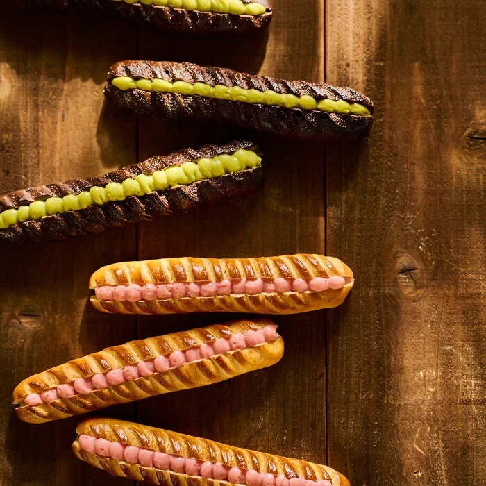 スタイリッシュなクープがポイントのヴィエノワ。ココアとプレーンの生地にピスタチオとベリーのクリームをしぼります。