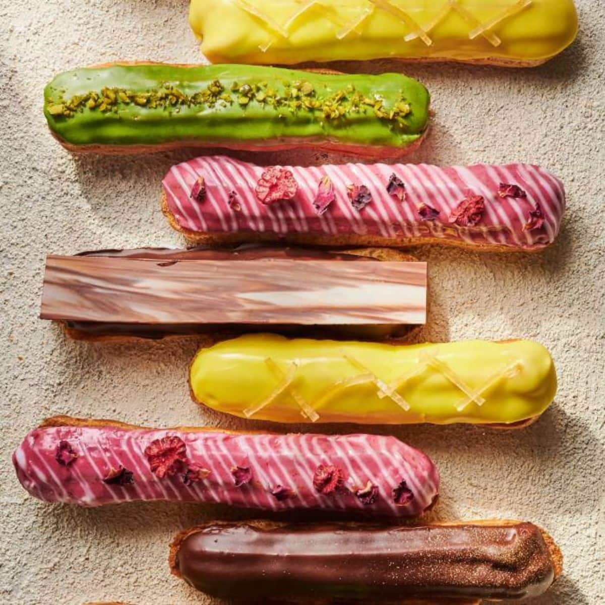 スタイリッシュに4色に仕上げるエクレール。シュー生地とクリームをよりおいしくリニューアルいたしました。カスタードクリームにエルダーフラワーコーディアルを合わせたさわやかな香りのクリームが新感覚のおいしさです。
