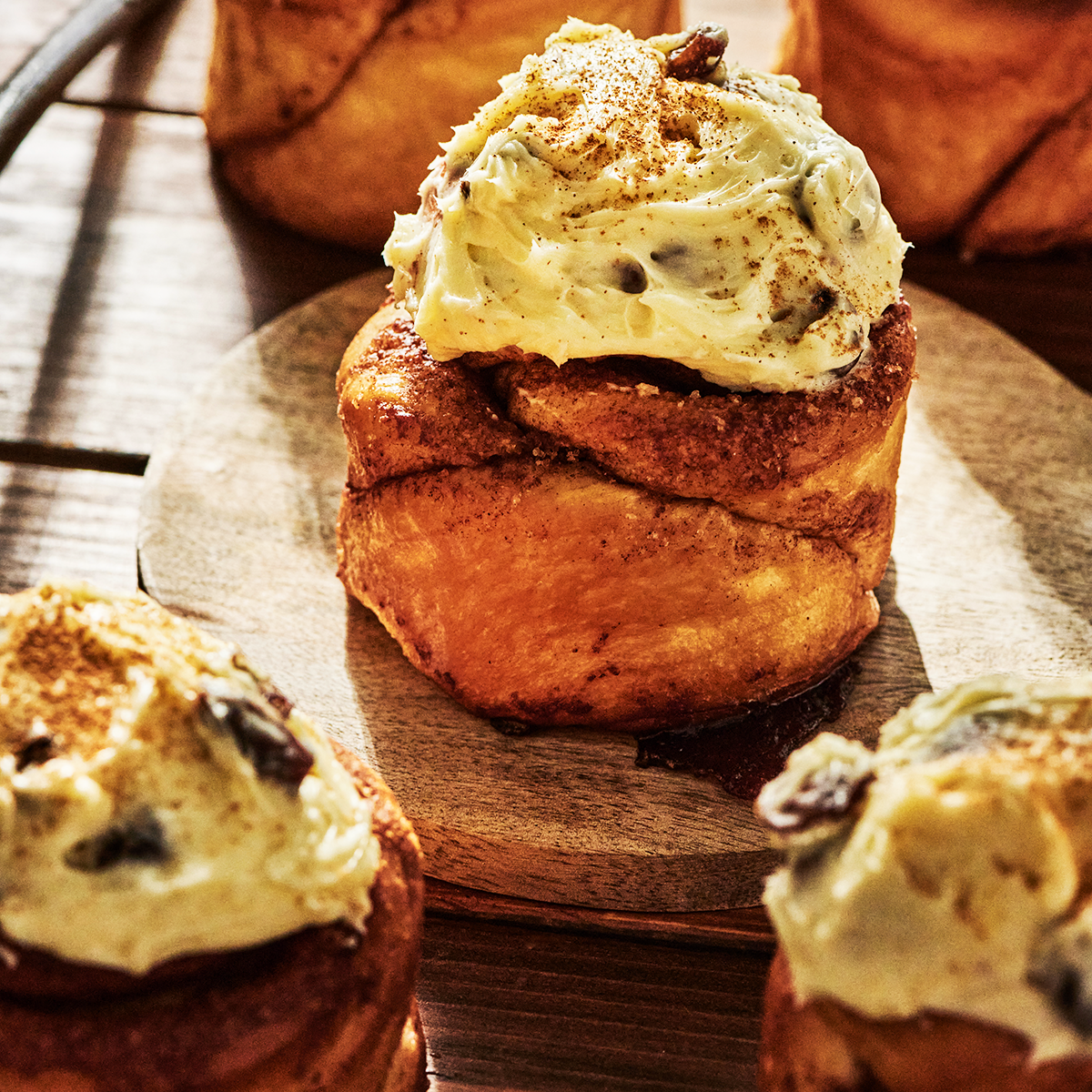 シナモンバターをたっぷり巻いて型で焼き、ラムレーズン香るチーズフロスティングでリッチに仕上げます。