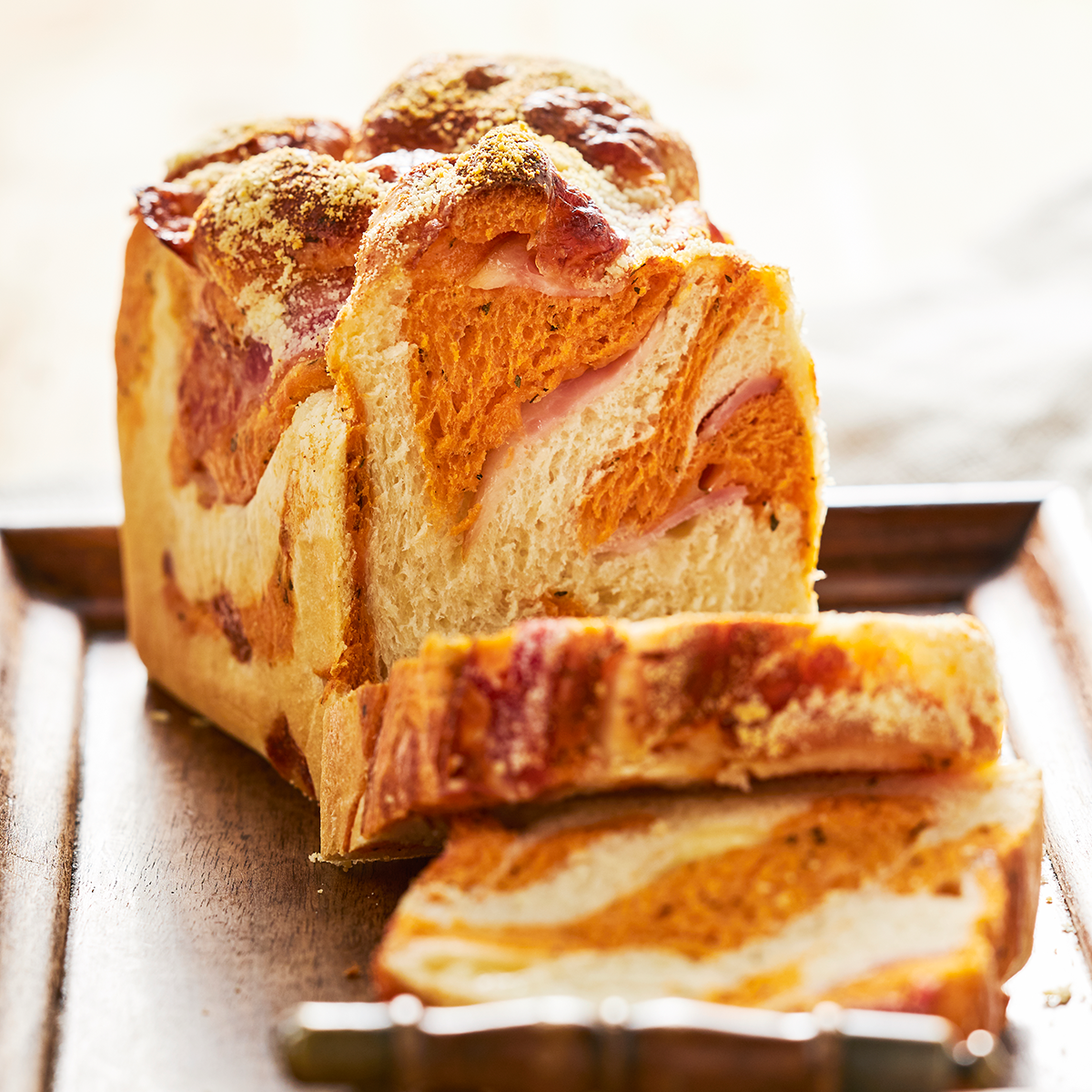 プレーンとトマトの2色生地に、モッツァレラチーズとベーコンを巻き 食パン型で焼き上げます。