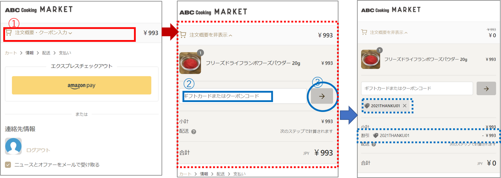 ①ご購入手続画面の右側に、注文概要・クーポン入力画面が表示されています。