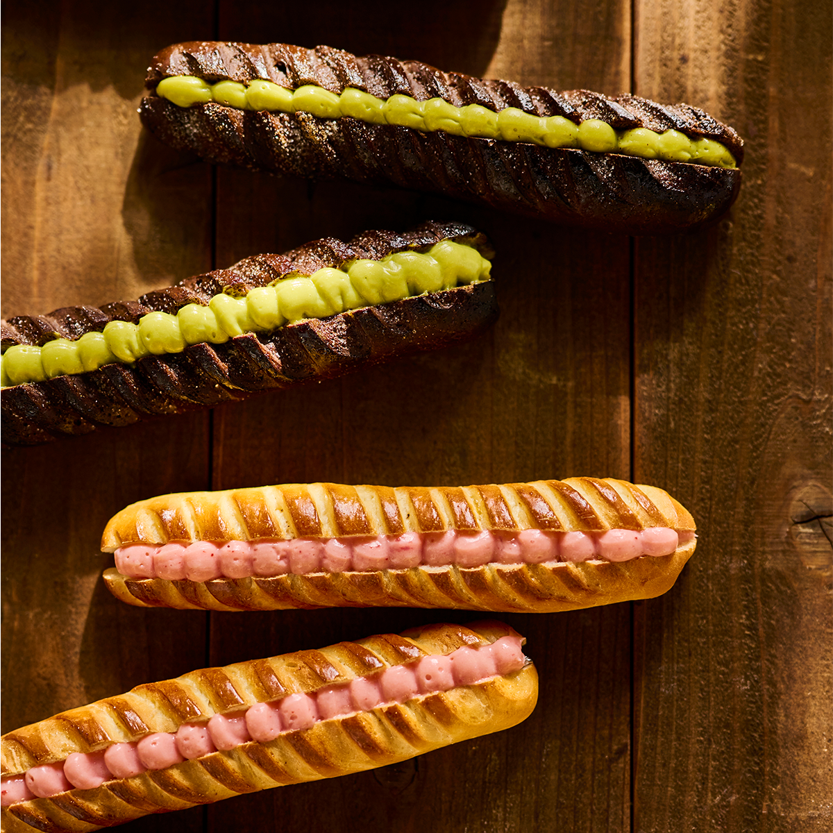 スタイリッシュなクープがポイントのヴィエノワ。ココアとプレーンの生地にピスタチオとベリーのクリームをしぼります。