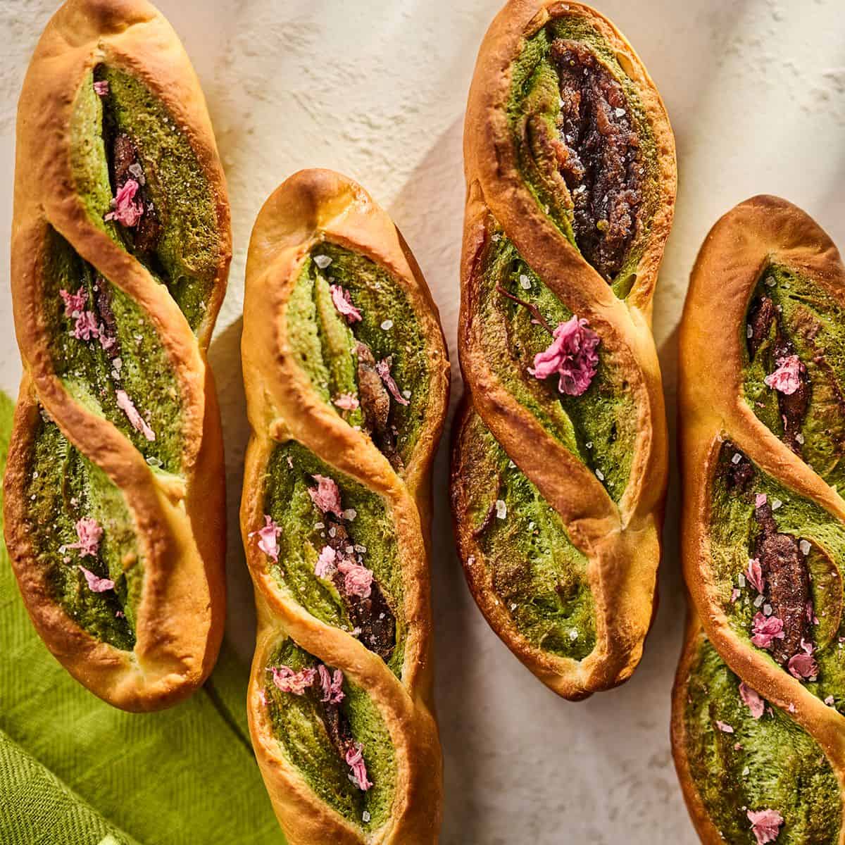 抹茶生地に粒あんを包んだ和スイーツパン。クープの入れ方がポイント。桜の花びらをちらして仕上げます。