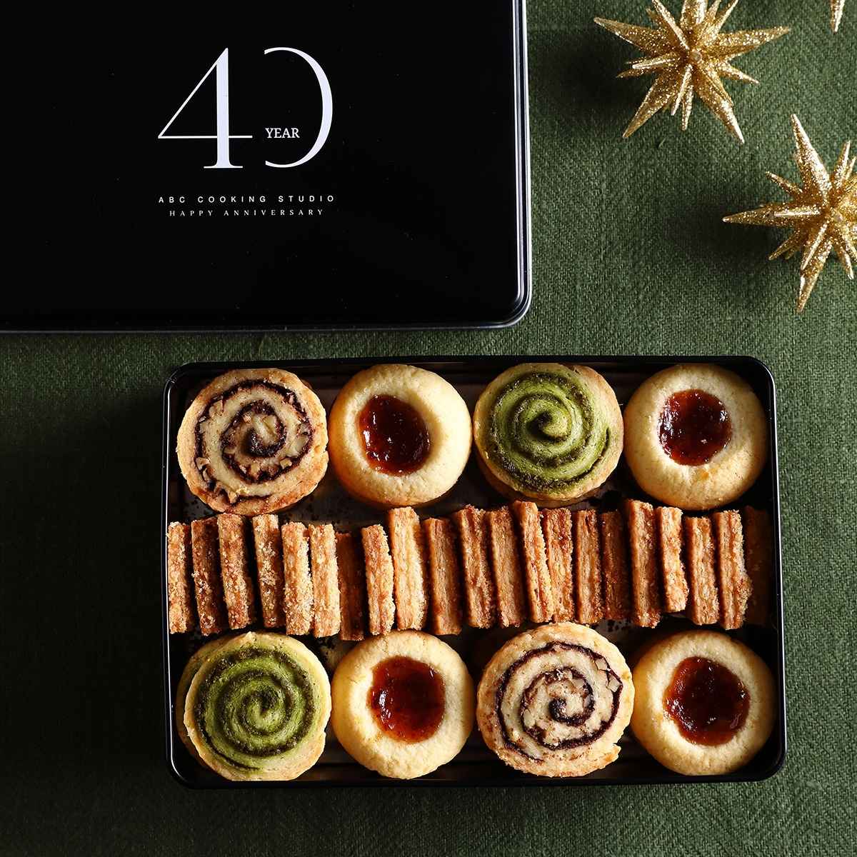 サクサクの渦巻きパイが2種類、香ばしいアーモンドパイ、色鮮やかなジャムクッキー。バターの香り豊かな4種類の焼き菓子を作って、ABCクッキングスタジオ40周年記念のクッキー缶に詰めたら、世界にひとつだけの特別なクッキー缶のできあがり。
