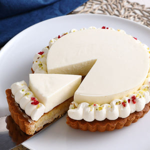 香ばしい全粒粉入りのタルト生地に、コクのあるチーズアーモンドクリームを流し入れて焼き上げた土台。その上に、ひんやり冷たいレアチーズをのせることで、しっかり焼いた香ばしさと、なめらかな口どけの両方が楽しめます。